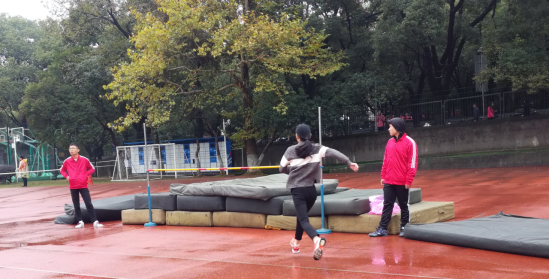 的运动健儿参加了跳高项目。天空飘着蒙蒙细雨,但是运动员们个个精神抖擞,在一段助力跑之后,撑杆纵身腾空一跃,在空中形成一条弧线。