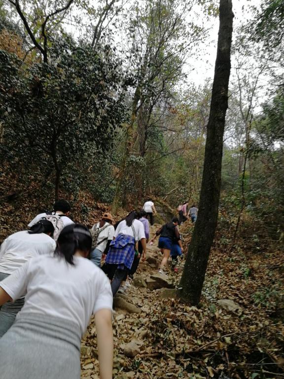 一切准备就绪后,李主任带领同学们从北校区后街出发。穿过静谧而充满田园气息的小路,一行人来到了岳麓山脚。由于极具特色的登山路线,让同学们对前面的登山旅途更加充满好奇。山路上的碎石,飞扬在空气中混合着大地气息的黄土杂尘,都成为同学们登山的小困难。李主任采取小目标的方式化解同学们的畏难情绪:登山中途休息三次,每次2分钟。在第一个休息点,大家尚且觉得登山不难;但是随着海拔的升高,山路逐渐崎岖。大家开始感受到了跋涉的艰辛。大家渴望早点到下一个休息点。在山路的陡峭之处,师生们可谓是手脚并用,脚踩着石缝,手揪着树枝,相互帮扶。虽然双腿在颤抖,但是登山决心坚定。在登顶前,李主任鼓励大家奔跑冲刺。经过近一个小时的奋力攀岩,大家终于登顶,并在山顶合影留念。