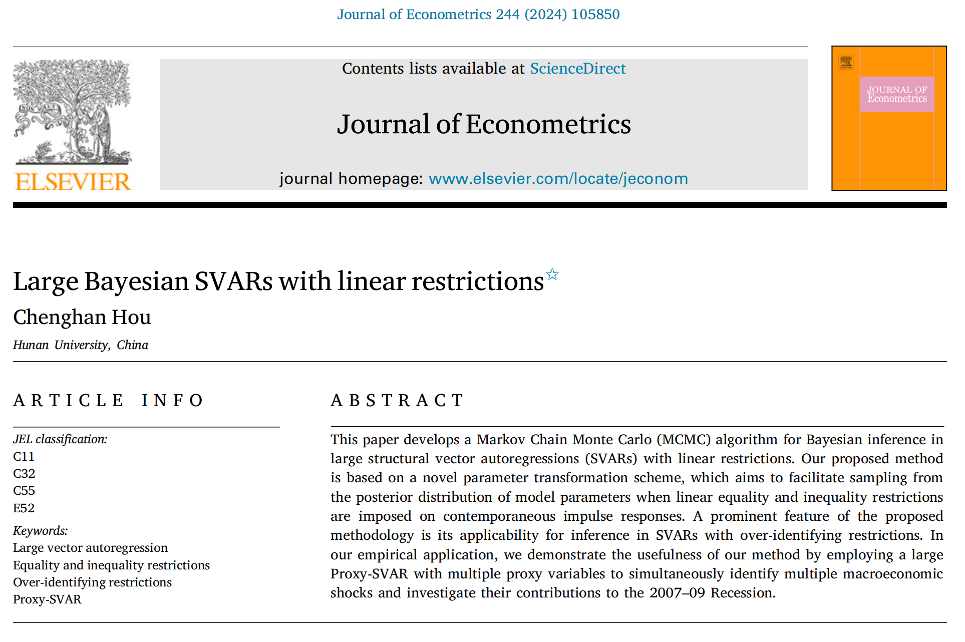 侯成瀚教师的独立作者论文“Large Bayesian SVARs with linear restrictions”在国际计量经济学顶级期刊《Journal of Econometrics》上发表。